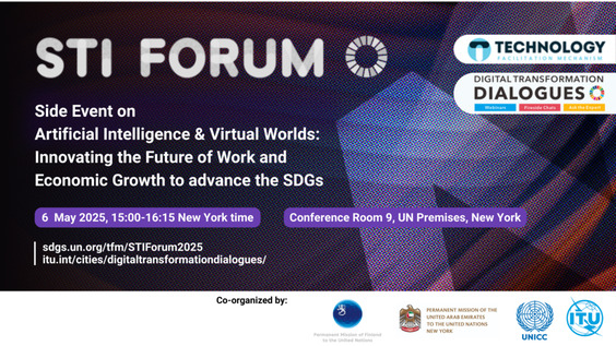 The International Telecommunication Union (ITU), the United Nations International Computing Centre (UNICC), the Permanent Missions of Finland, the United Arab Emirates, and Tanzania to the United Nations, are co-hosting the STI Forum 2025 side event titled "Artificial Intelligence & Virtual Worlds: Innovating the Future of Work and Economic Growth to advance the SDGs". This event will take place on 6 May 2025, from 15:00 to 16:15 (New York time) in New York. This side event is also organized as part of ITU's Digital Transformation Dialogues.